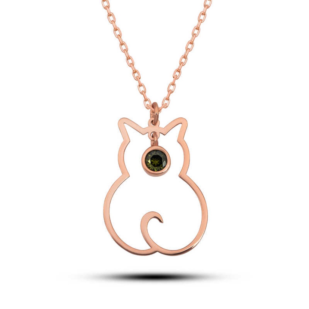 Her bir doğum taşı, belli bir ayla özdeşleşmiştir. Ağustos ayı doğum taşı Peridottur. Onur, koruma duygusu ve saflığı sembolize eder. Ayrıca sabır ve güven duygularını geliştirir. Sertlik derecesi 6,5 ile 7 arasındadır. Sarı ve yeşil tonlarını barındırır. Mısırlılar tarafından güneşin mücevheri olarak anılmaktadır. Taşın özelliği gece karanlığında da parlaması ve koyu yeşil bir renge bürünmesidir. Peridot refahı ve rahatlığı simgeler. Evlerimizin sevimli neşe kaynağı kediler, temiz olmalarının yanı sıra masumiyetin simgesidir. Asil ve mantıklı bir kişiliğe, mükemmel sezgilere ve akılcı bir duyarlılığa sahiptirler. Özel günlerin en tercih edilen hediye seçeneklerinden olan gümüş takılar, sevdiklerini mutlu etmek ve onlara her an yanlarında taşıyabilecekleri bir hediye vermek isteyenler için tasarlandı. Masumiyetin simgesi olan kedi figürlü gümüş kolye modelini kız kardeşinize, sevgilinize ya da arkadaşlarınıza armağan edebilirsiniz. Peridot taşlı kedi kadın kolye modeli 925 ayar gümüşten imal edilmiştir. Gümüş üzerine rose kaplama yapılmıştır. Rose kaplama yapılan gümüş kedi kolye modelleri parlaklığını uzun süre muhafaza eder ve oksitlenmesi gecikir. Kolye üzerinde bulunan tüm taş Peridottur. Gümüş olan zincir boyu ortalama 45 cm'dir. Gümüş kadın kedi kolye diğer tüm gümüş kadın kolye modellerinde olduğu gibi el emeği ile üretilmiştir. Gümüş ve değerli taşlar nedeniyle belirtilen ortalama ürün ağırlığında ± %10 sapma olabilmektedir.
