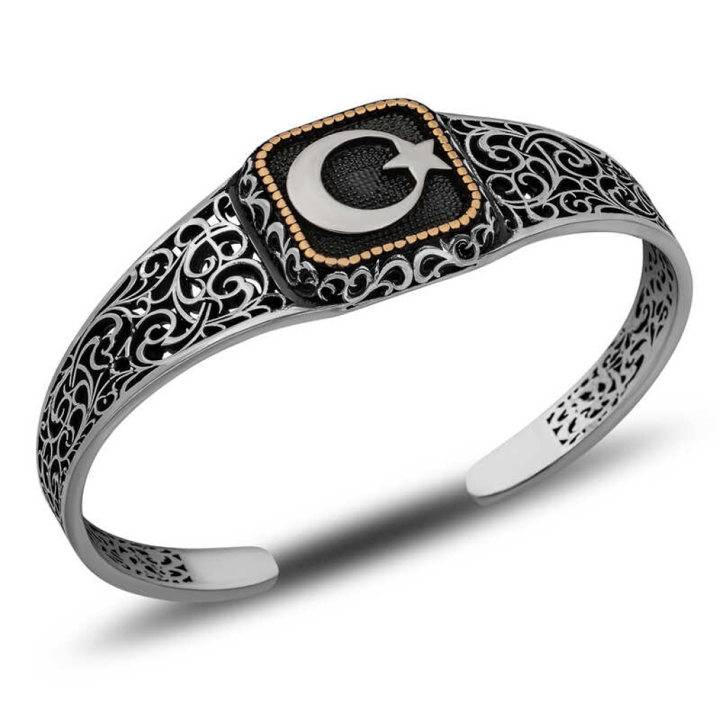 Gümüş Ay Yıldız Ayarlanabilir Kelepçe Erkek Bileklik