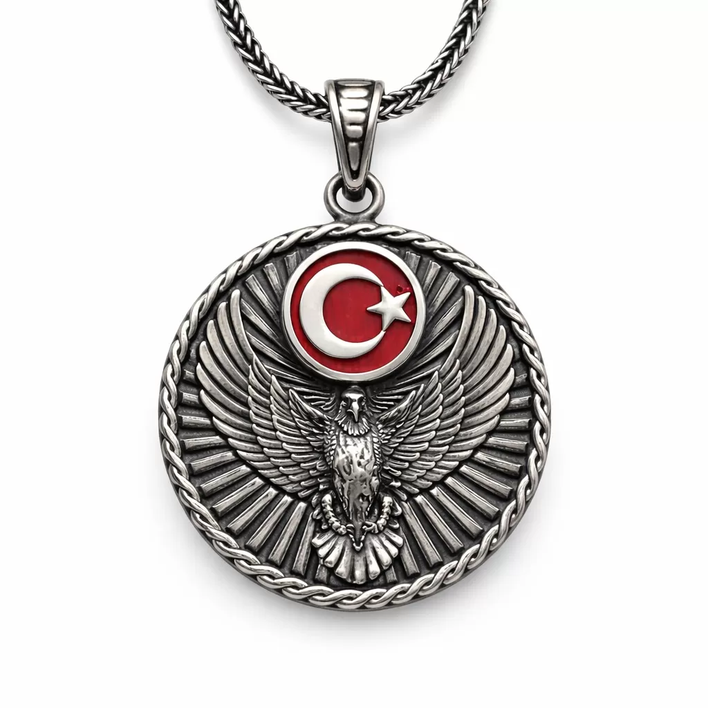 Gümüş Türk Kartalı ve Ay Yıldız Motifli Erkek Kolye