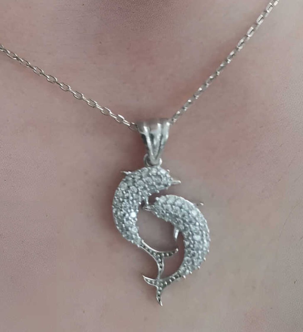 Gümüş Çift Yunus Balığı Kadın Kolye