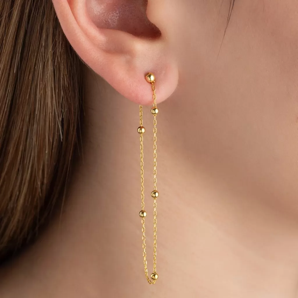 Gümüş Çift Zincirli Gold Top Detaylı Kadın Küpe