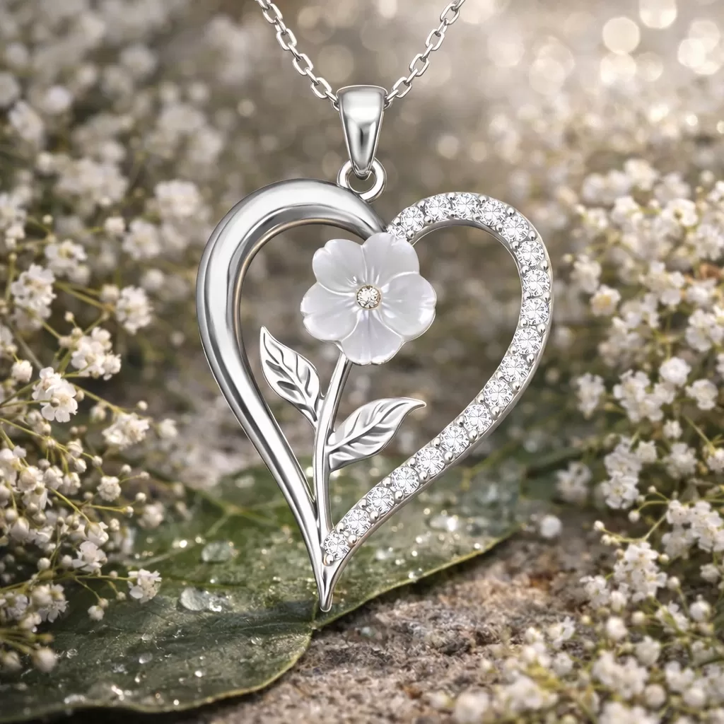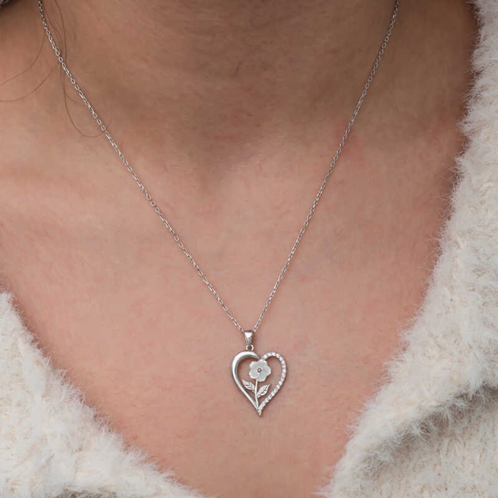 Gümüş Kalpli Beyaz Gül Kadın Kolye