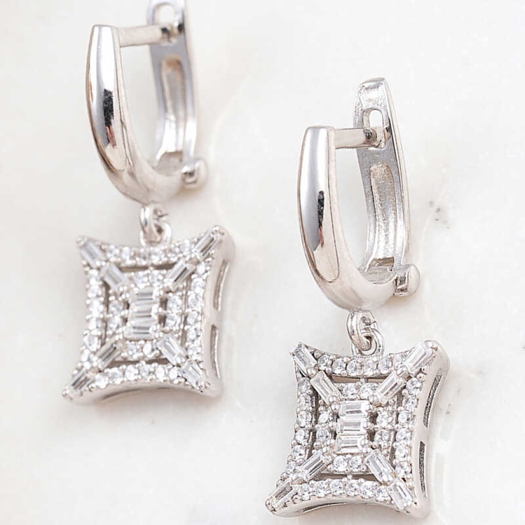Gümüş kare zirkon taşlı kadın küpe; sade ve şık tasarımıyla kendinizin ve sevdiklerinizin severek kullanacakları bir model. Kare zirkon taşlı kadın küpe 925 ayar gümüşten imal edilmiştir. Gümüş üzerine rodyum kaplama yapılmıştır. Rodyum kaplama yapılan kadın küpe modelleri parlaklığını uzun süre muhafaza eder ve oksitlenmesi gecikir. Küpe üzerinde bulunan taşlar zirkon ve bagettir. Tüm kadın küpe modellerinde olduğu gibi kare zirkon taşlı kadın küpe de el emeği ile üretilmiştir. Gümüş ve değerli taşlar nedeniyle ürün ağırlığında ± %10 sapma olabilmektedir.