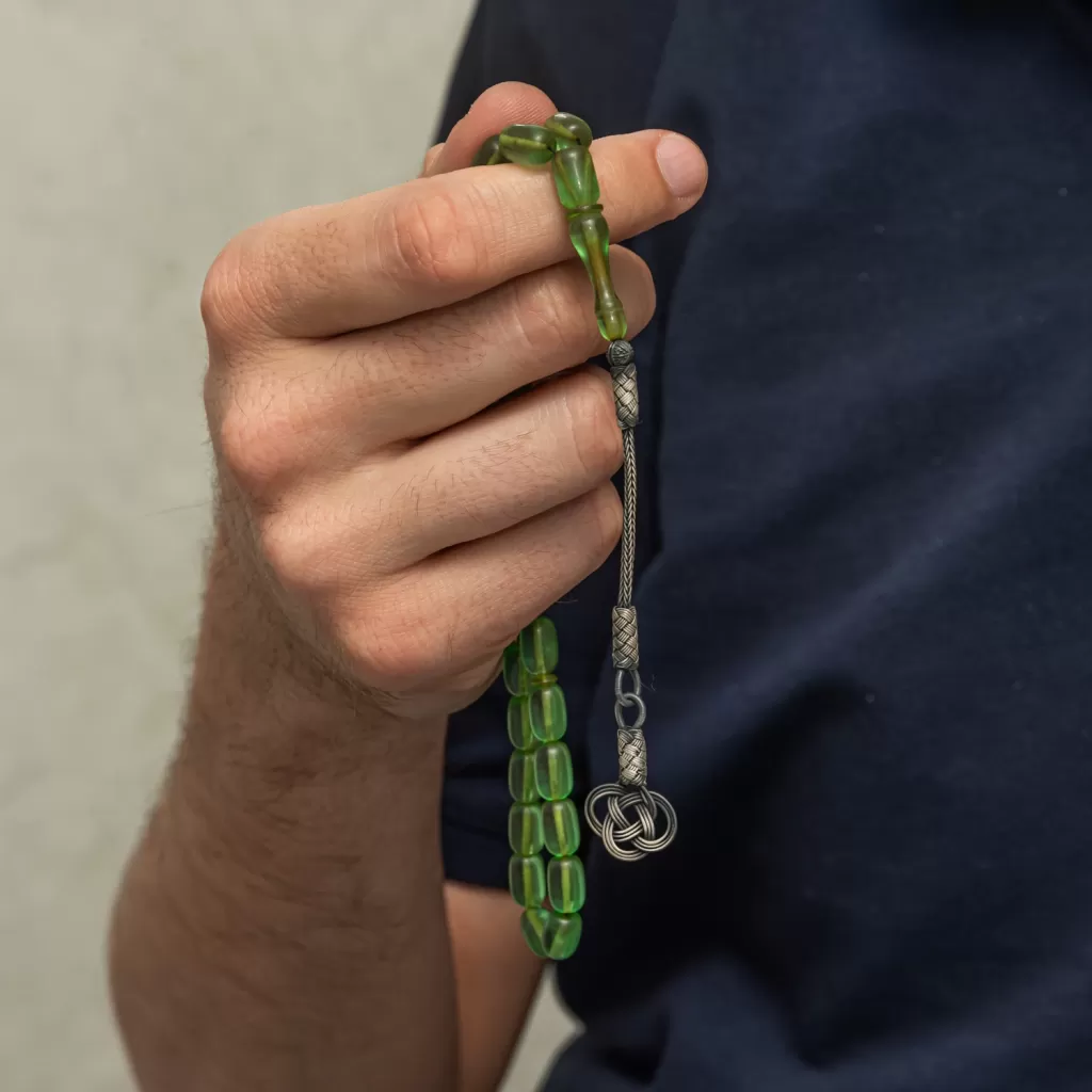 Gümüş Kazaz Püsküllü Kapsül Kesim Yeşil Sıkma Kehribar Tesbih