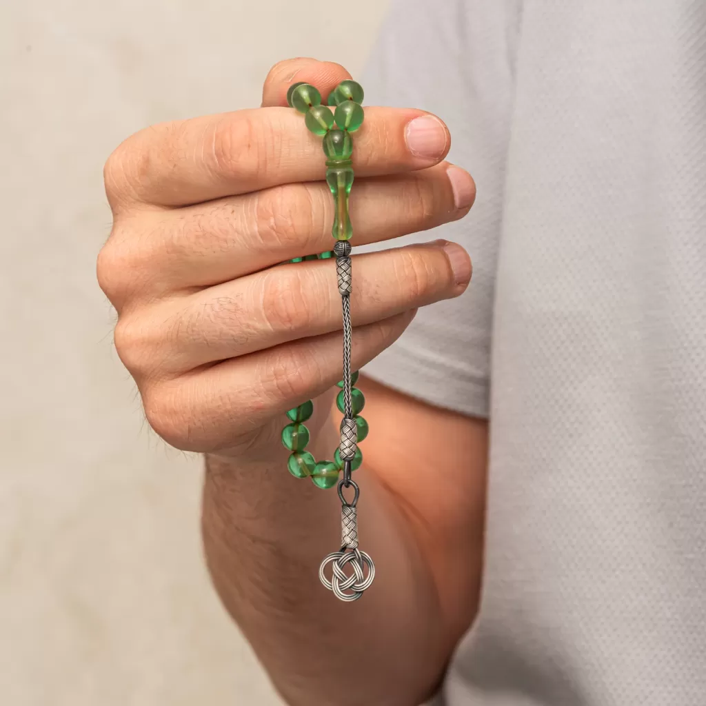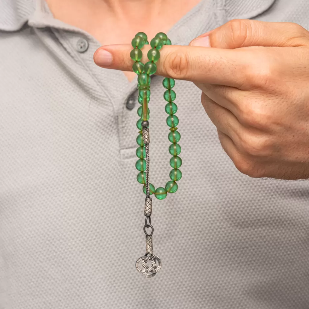 Gümüş Kazaz Püsküllü Yeşil Sıkma Kehribar Tesbih