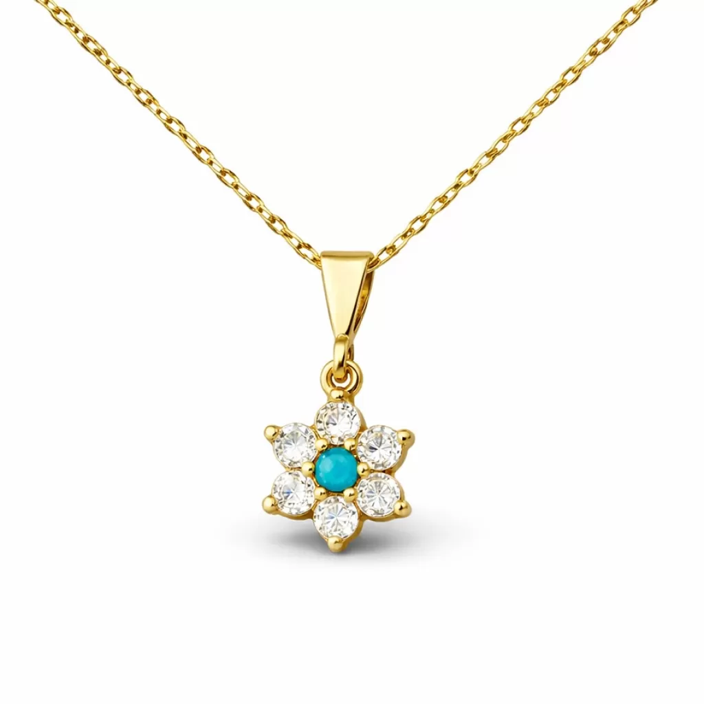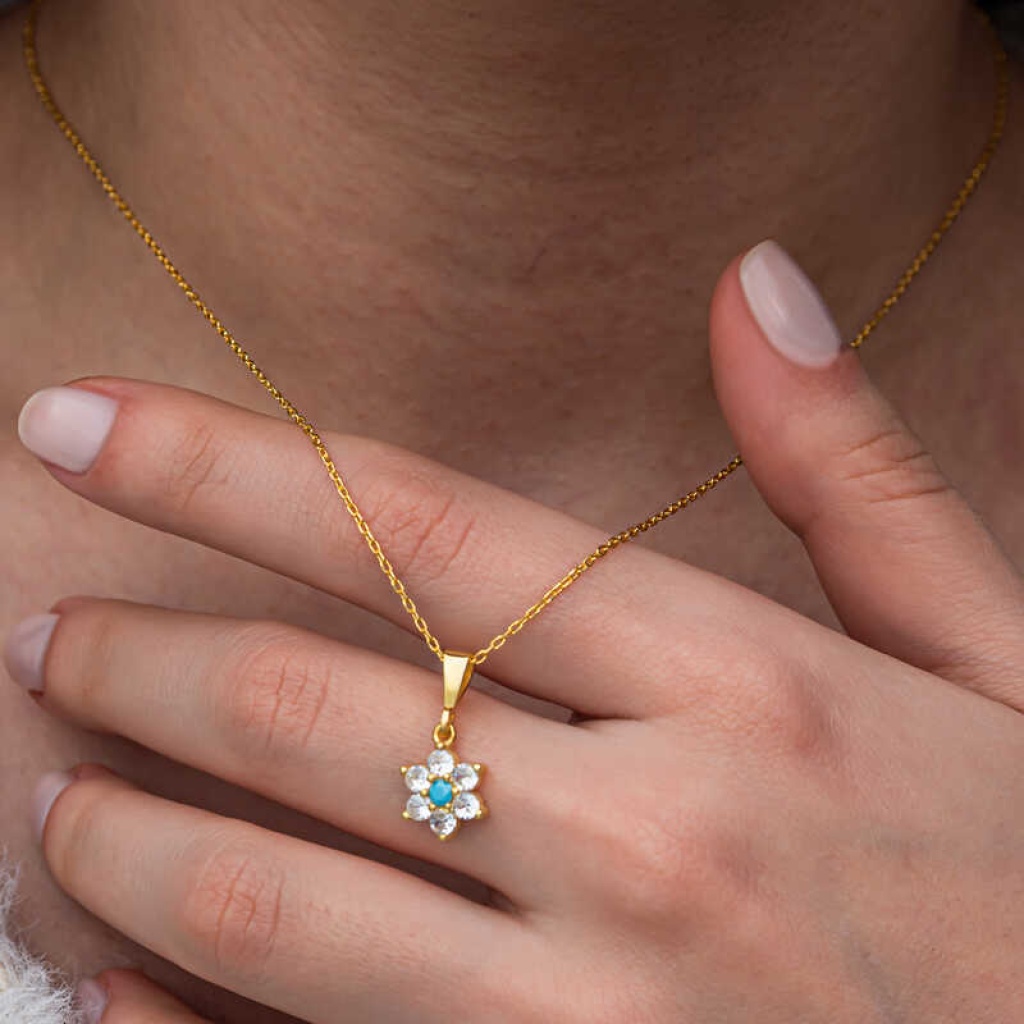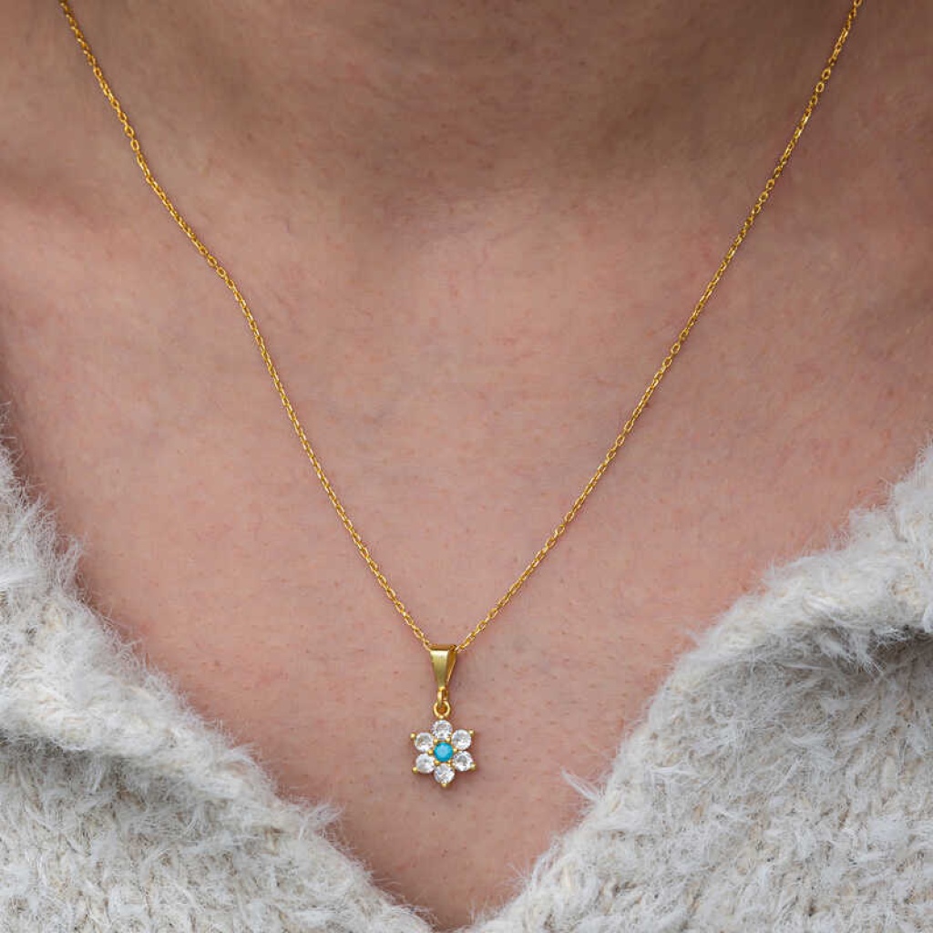 Gümüş Mavi Taşlı Gold Çiçek Kadın Kolye