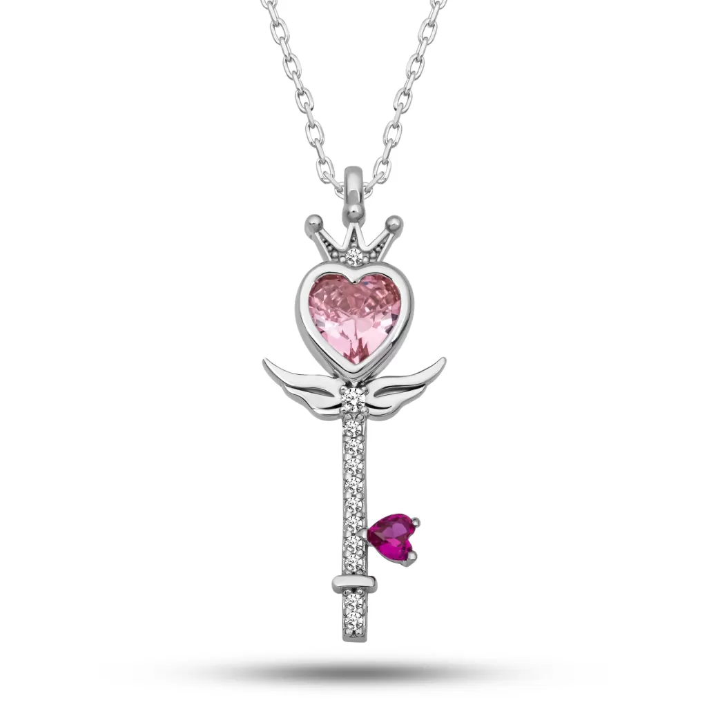 Gümüş Pembe Kalp Taç Anahtar Kadın Kolye