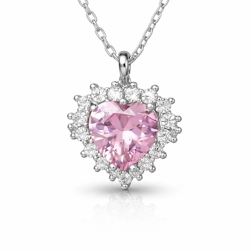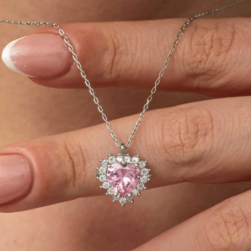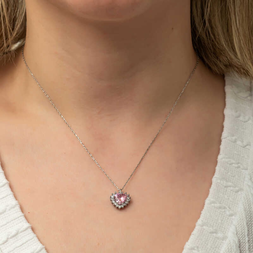 Gümüş Pembe Taşlı Kalp Kadın Kolye