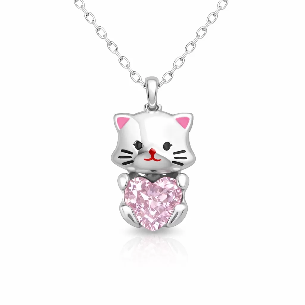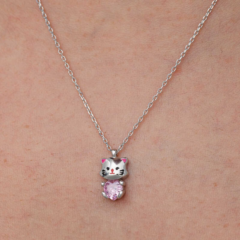 Gümüş Pembe Taşlı Sevimli Kedi Kadın Kolye