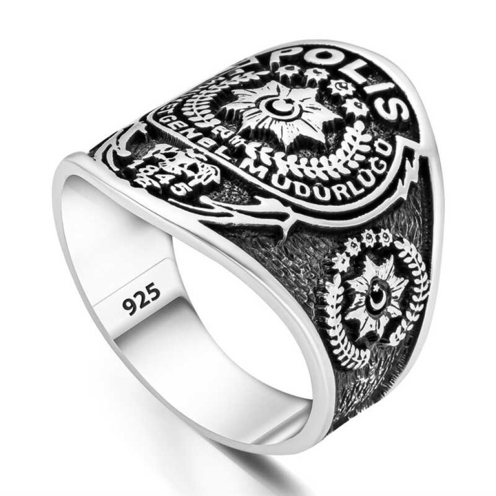 Gümüş Polis Armalı Türk Desenli Erkek Yüzük