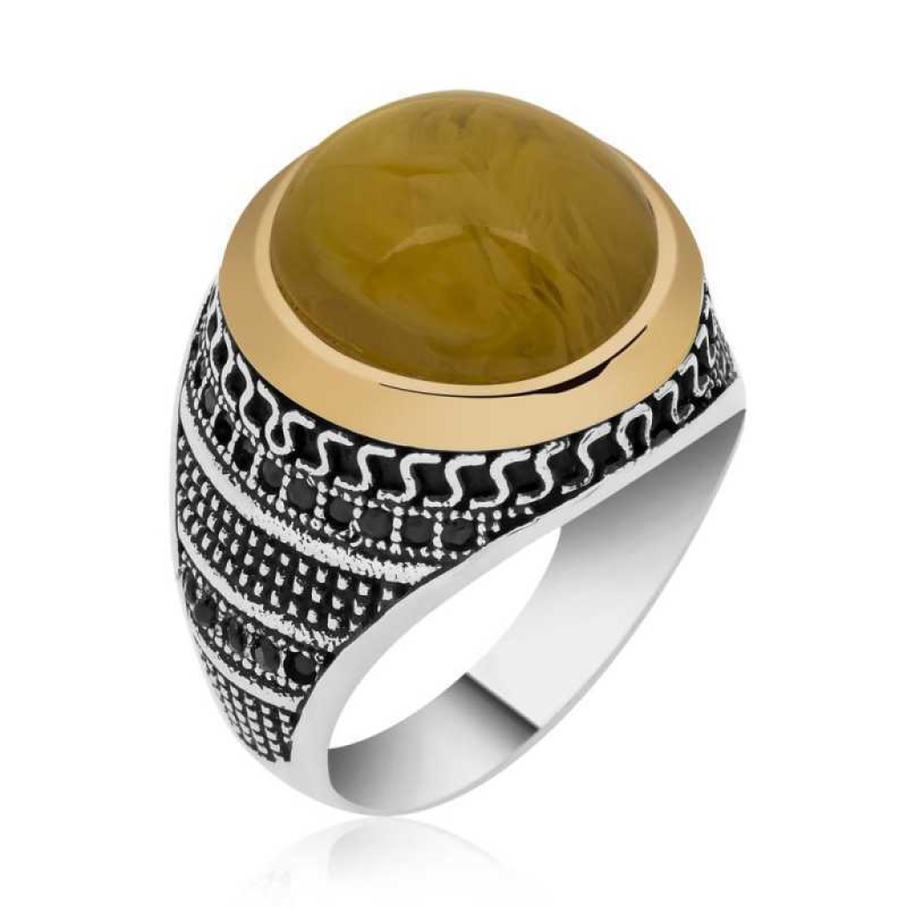Gümüş Sıkma Kehribar Taşlı Erkek Yüzük