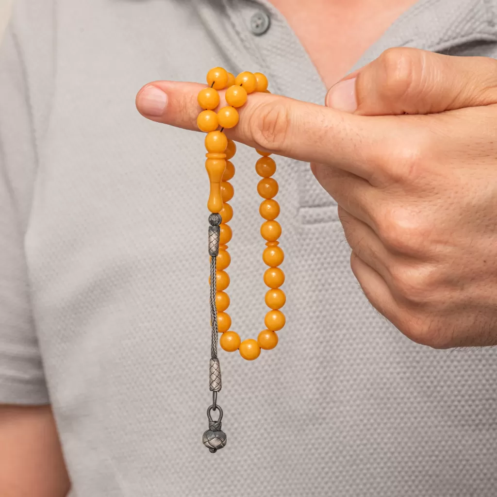 Gümüş Top Kazaz Püsküllü Sarı Yuvarlak Sıkma Kehribar Tesbih