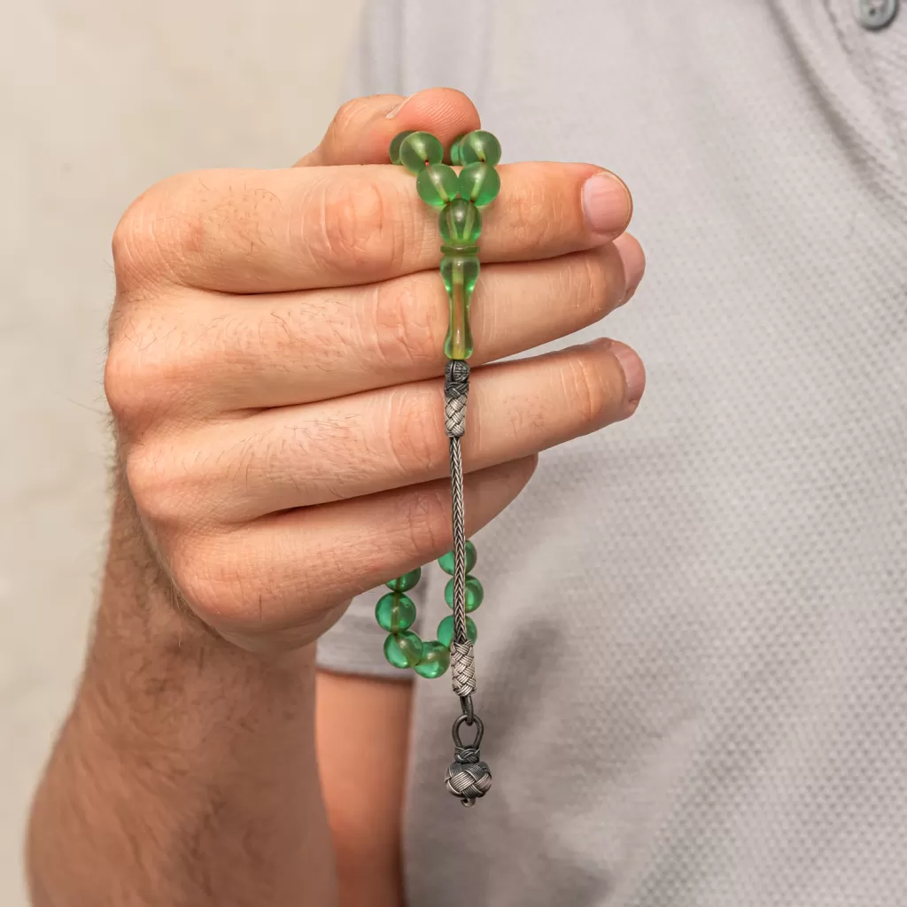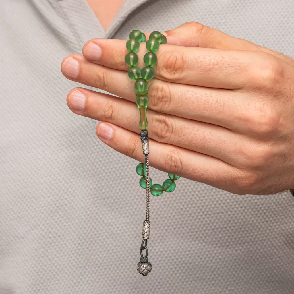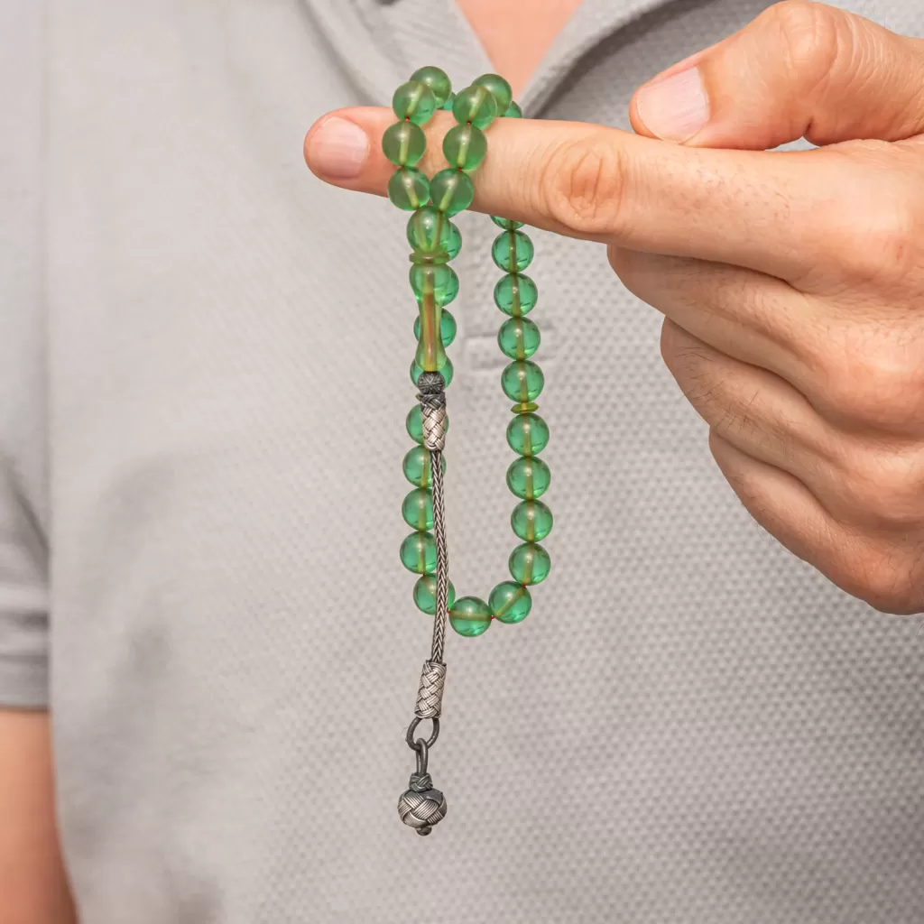 Gümüş Top Kazaz Püsküllü Yeşil Sıkma Kehribar Tesbih