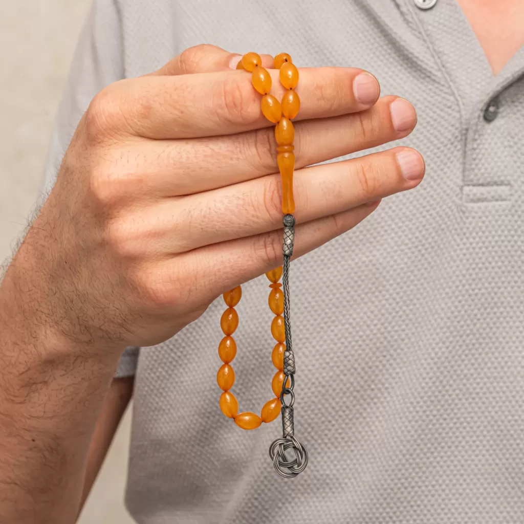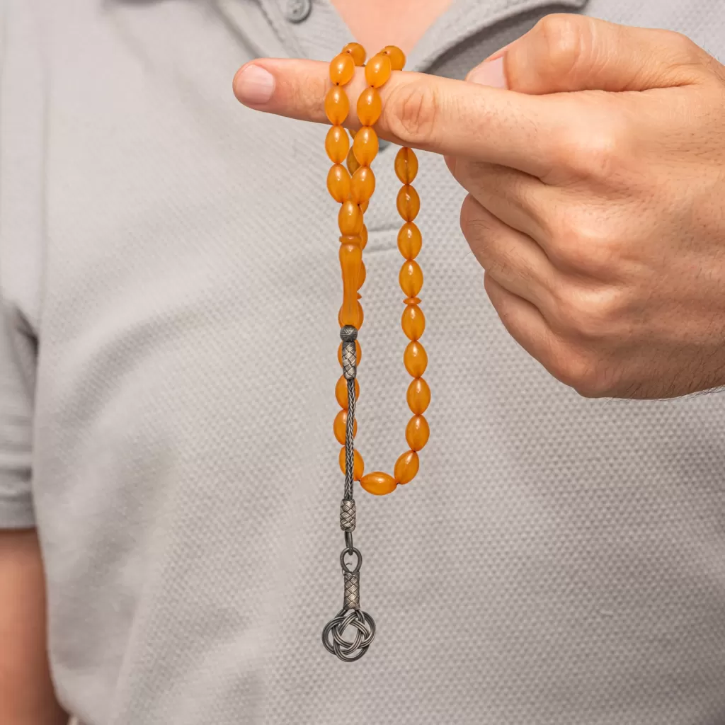Gümüş Turuncu Kazaz Püsküllü Sıkma Kehribar Tesbih