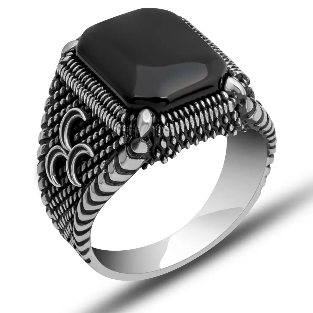 Gümüş Üç Hilal Oniks Erkek Yüzük