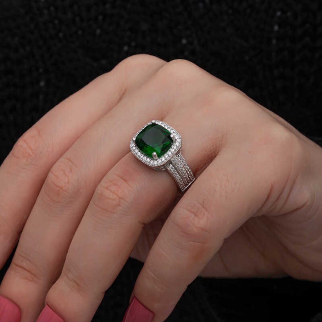 Gümüş Yeşil Baget Kare Kadın Yüzük