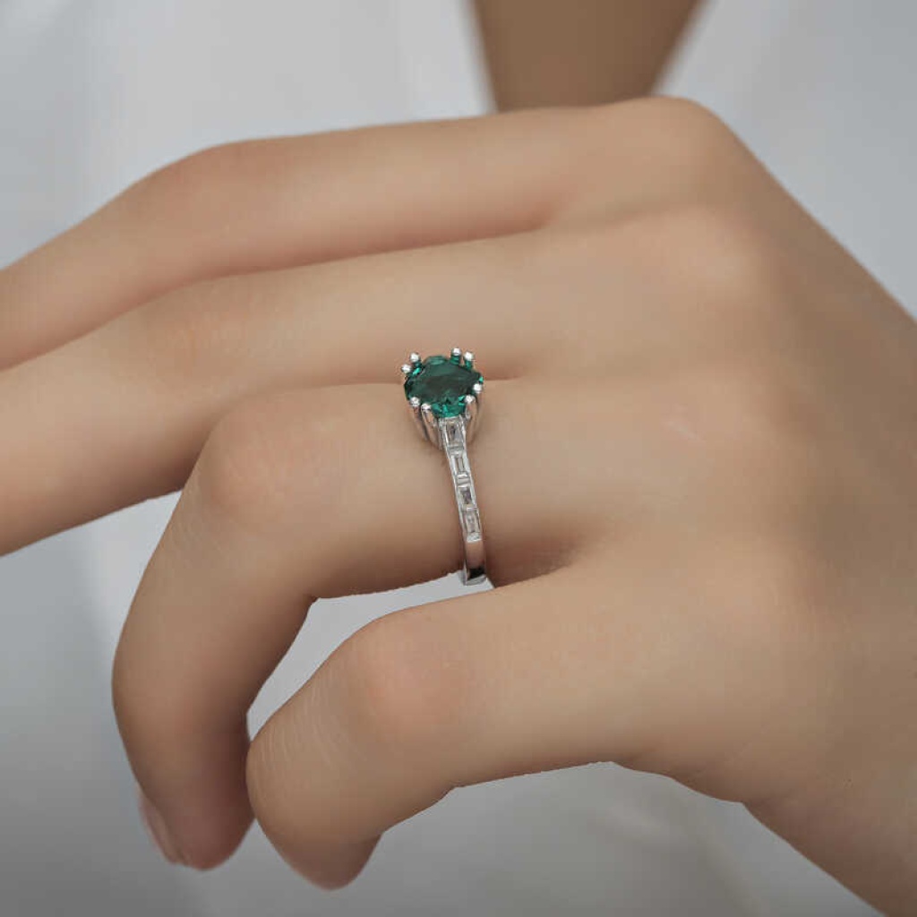 Gümüş Yeşil Baget Tek Taş Kadın Yüzük