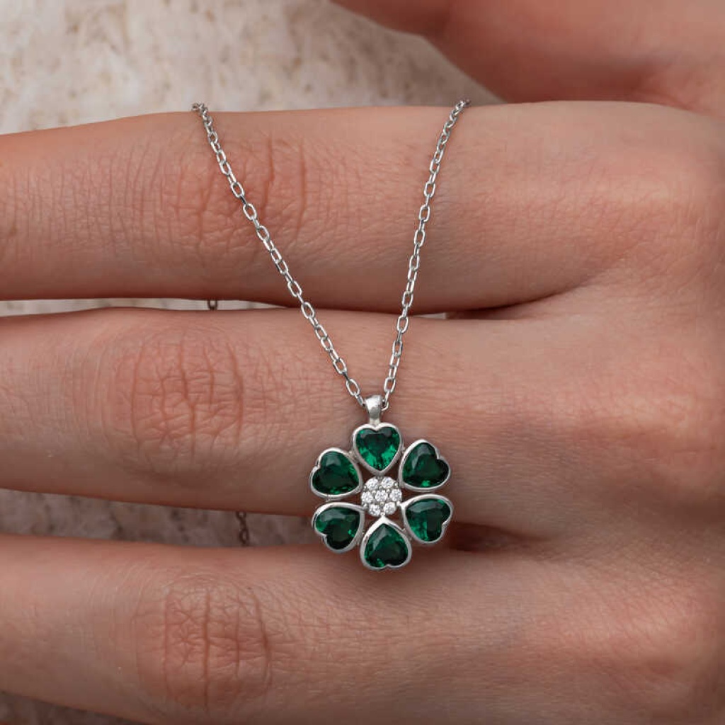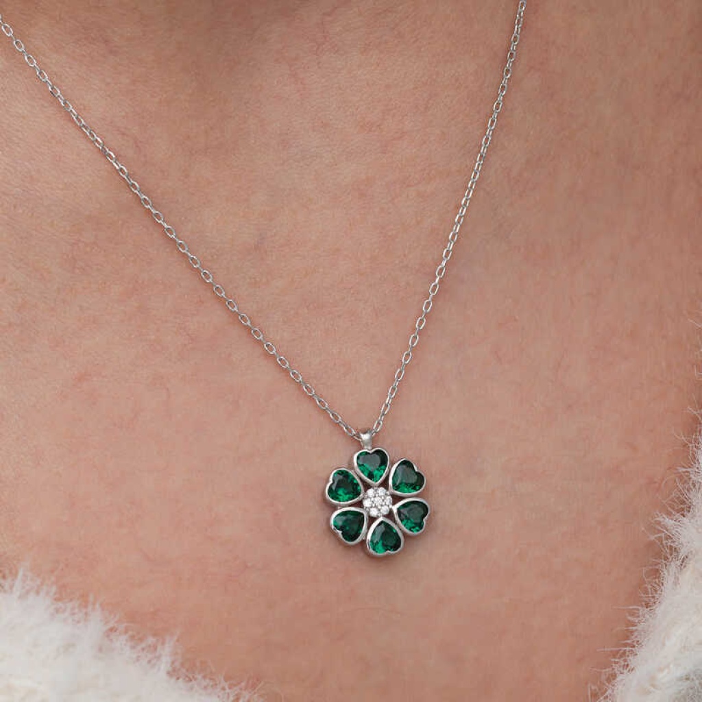 Gümüş Yeşil Kalpli Çiçek Kadın Kolye